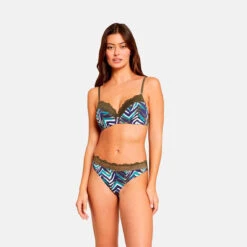 La forme triangle des bonnets offre un effet naturellement rebondi de la poitrine afin de former un joli décolleté. Confectionné entièrement en coton, ce modèle offre confort et bien-être à vos seins. Les motifs géométriques très visuels des galons ajoutent de la modernité à la maille.