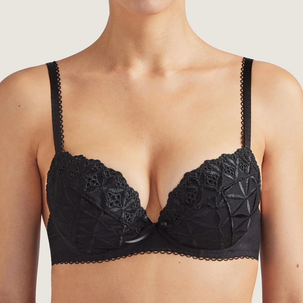 Ce soutien-gorge push-up recentre et donne du volume à la poitrine grâce à son entre-sein rapproché et ses coussinets. Doté d’armatures, il assure un maintien optimal au buste. La jolie broderie anglaise sublime le décolleté et ajoute une note de fraîcheur et de féminité à toute la pièce. De petits picots bordent la moitié des bretelles et la basque pour une allure glamour.