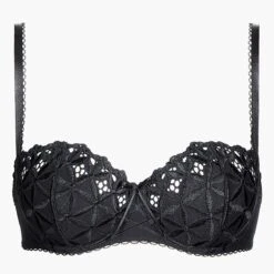 Soutien gorge armatures tout en dentelle florale finition effet de cils. Décolleté classique avec galon de dentelle. Forme emboitante. Bonnets doublés d’une matière douce et rigide. Noeud fantaisie et bijou émaillé amovible à l’entre-seins. Basque élastiquée sous poitrine. Tulle plumetis sur les ailes. Finitions dos cheminée. Bretelles larges et réglables. Fermeture 3 agrafes 3 positions. Disponible du 95C au 110F
