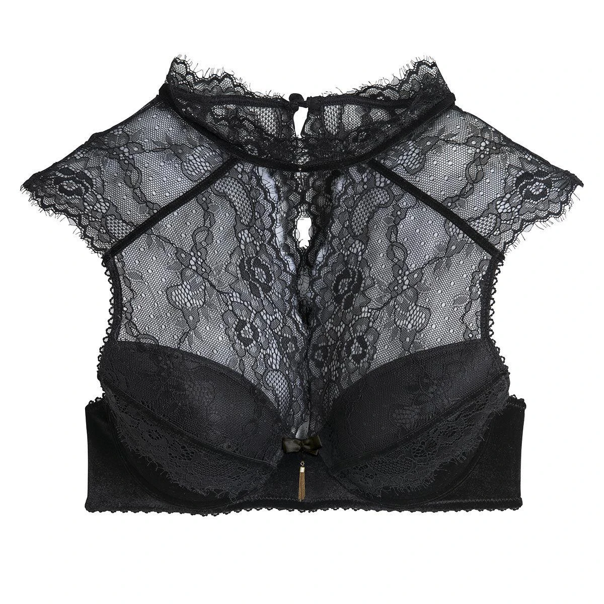 En velours strech et dentelle, on adore son col ras de cou en tout dentelle, et son décolleté transparent en dentelle géométrique effet de cils.