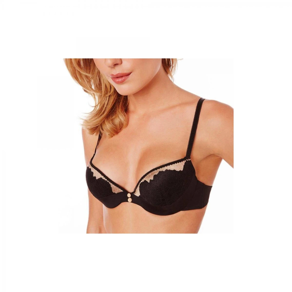 Soutien-gorge forme push-up à armatures. En dentelle noire avec dessin doré sur les hauts bonnets. Bas bonnets en microfibre noire. Deux boutons recouverts de microfibre dorée entre les seins. Baleines sur les côtés. Dos en tulle noir. Bretelles fantaisie élastiquées et réglables. Dos réglable 2 agrafes 3 positions.