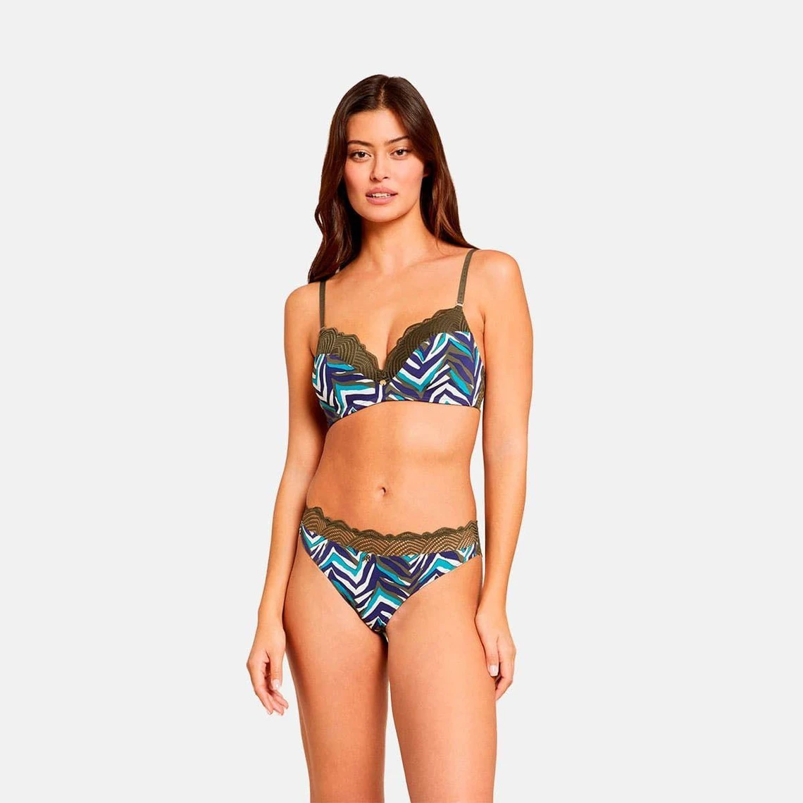 Sans armatures, vous serez à votre aise en toute occasion lors de son port. Il possède un devant en imprimé bleu et vert irrésistible. Des parties de dentelle ornent le haut, avec des bords débordés.